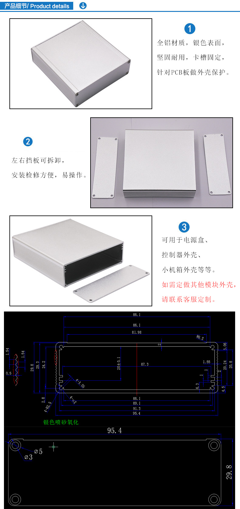 特點:1.全鋁材質(zhì),銀色表面,堅固耐用,卡槽固定,針對PCB板做外殼保護。