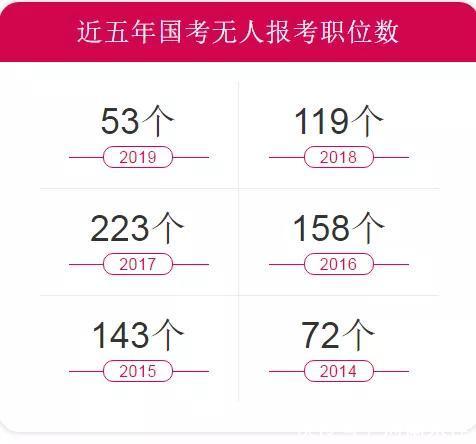 2019年國考共53個職位無人報考,2018年國考共119個職位無人報考。2018年無人報考職位全部來自中央國家行政機關直屬機構(省級及以下)和參照公務員法管理事業單位兩個系統,分別有75、44個職位無人報名,中央部委職位全部有人報考,僅1個省級職位無人報考,其余全部來自市及以下職位。